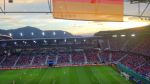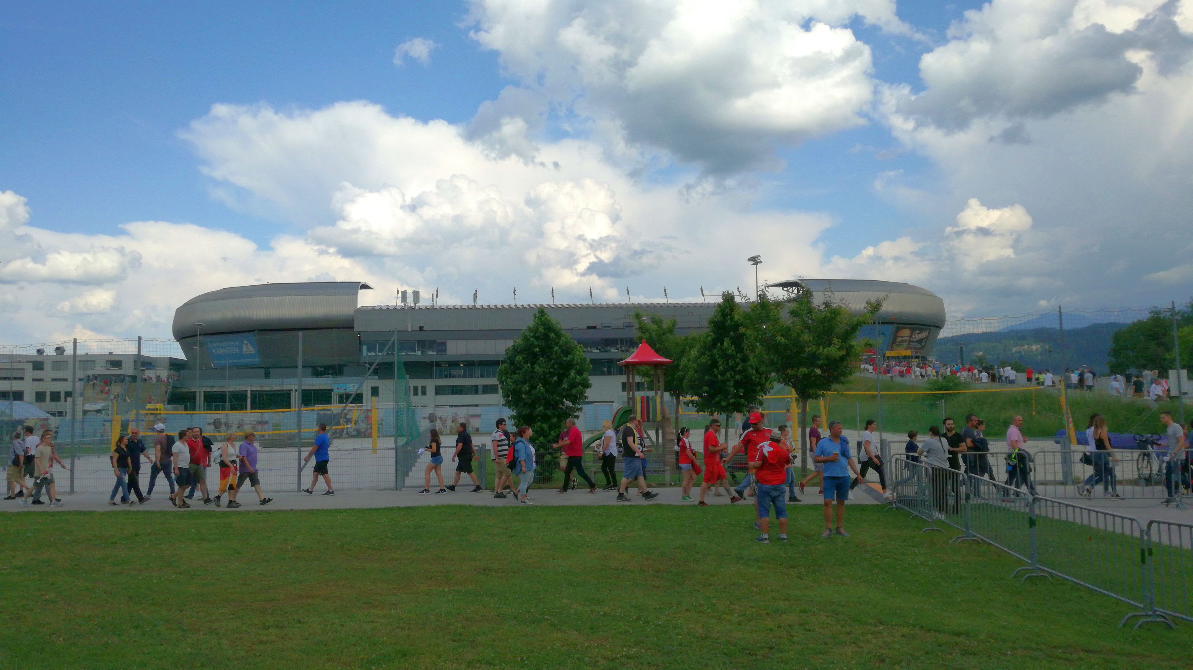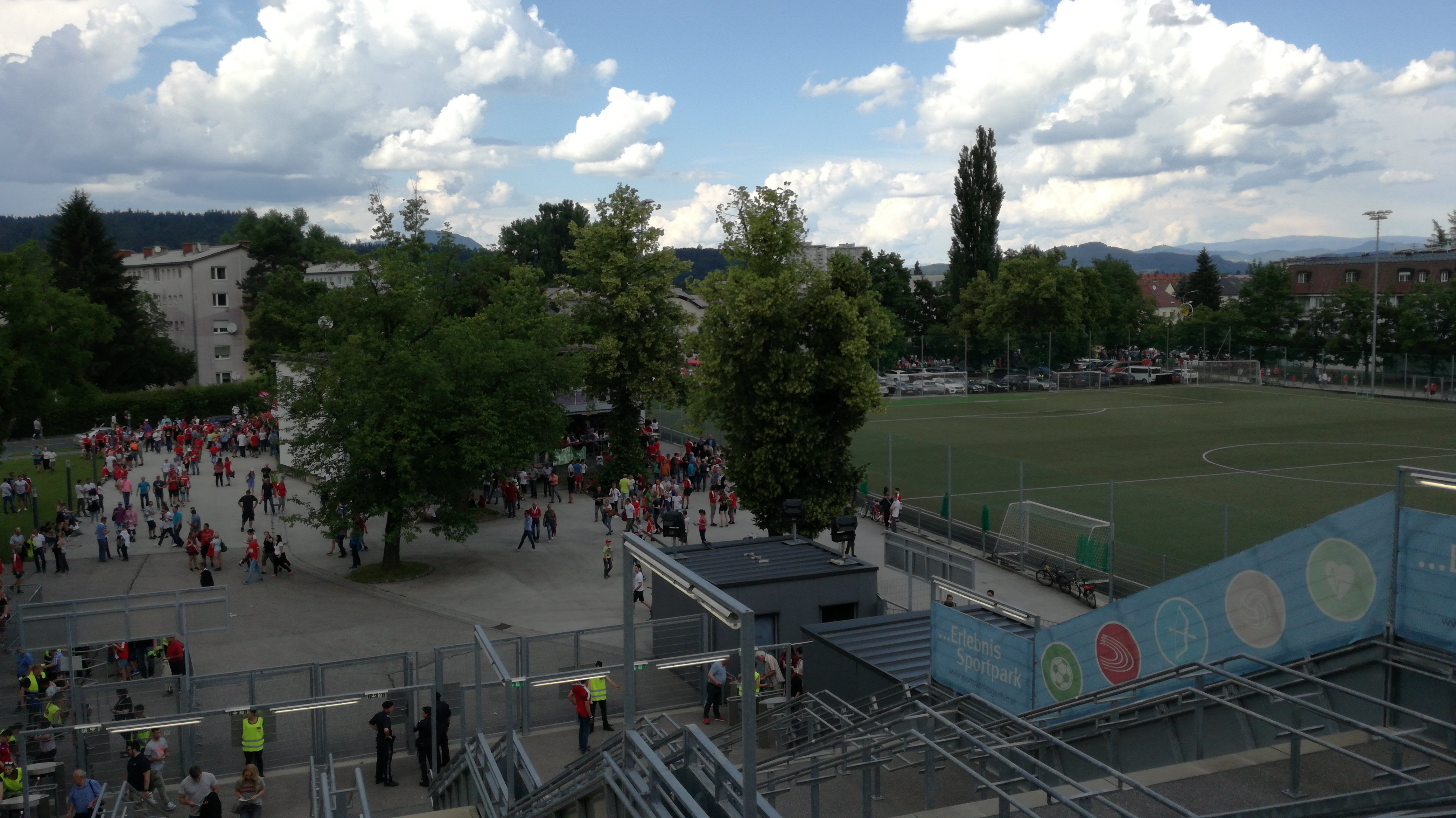 So richtig ortskundig waren wir ja nicht, aber wir wussten, also eher Wanderkamerad Robert, der wusste, Richtung Minimundus, dann Richtung Uni, dann schau mer mal. Und man konnte das alles gar nicht verpassen, aus allen Ecken strömten Fussballinteressierte, sangen sich ein und suchten den Weg. Wir schritten tapfer voran, trotzten der Hitze und bemerkten die Eintrübung am Himmel. Gut, Klagenfurt, da ists immer was trübe. Aber das sah nach mehr aus. Daher war unser Ziel, ab ins Stadion, dann darfs gerne schütten. Hallo Vorahnung!