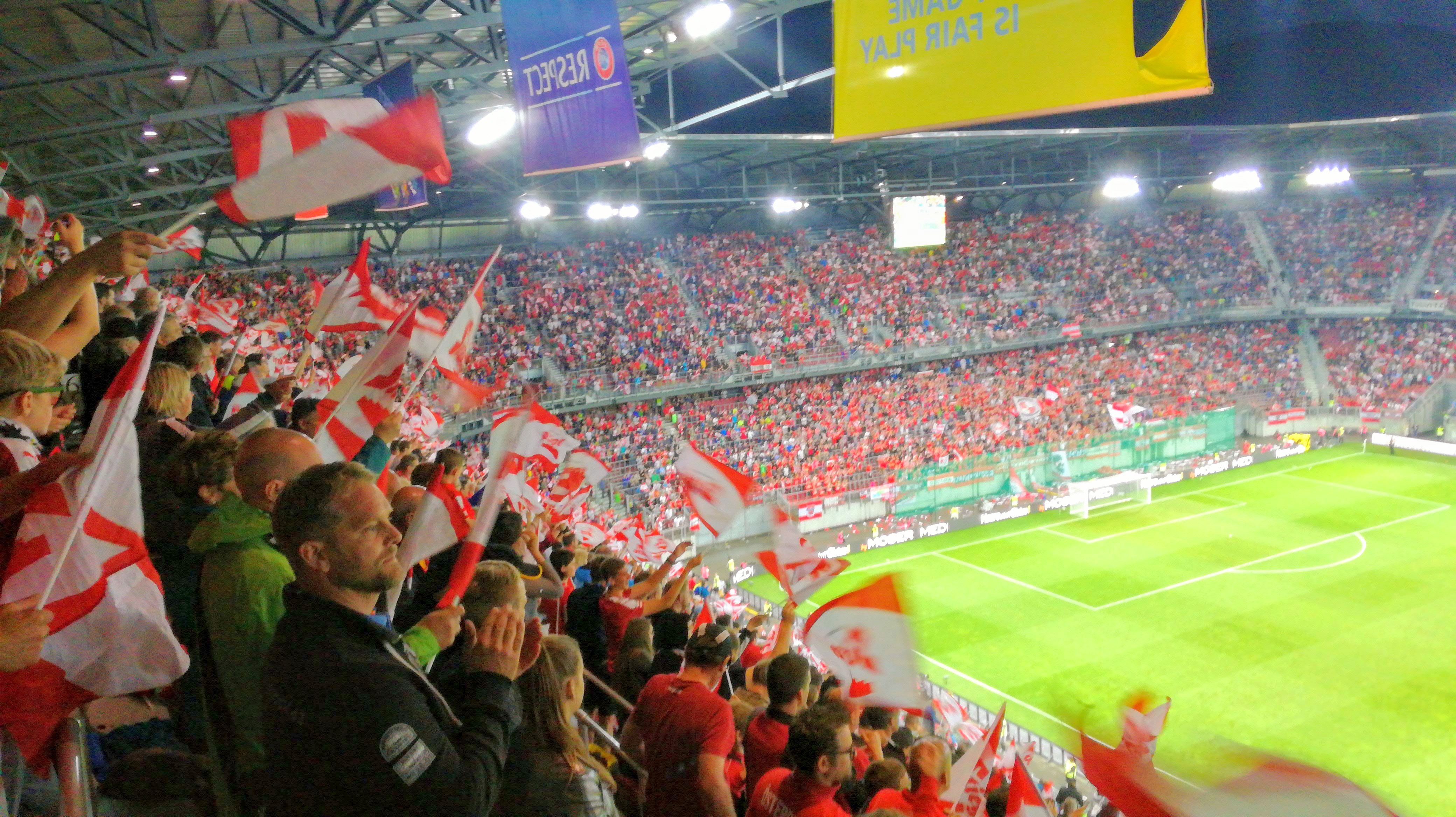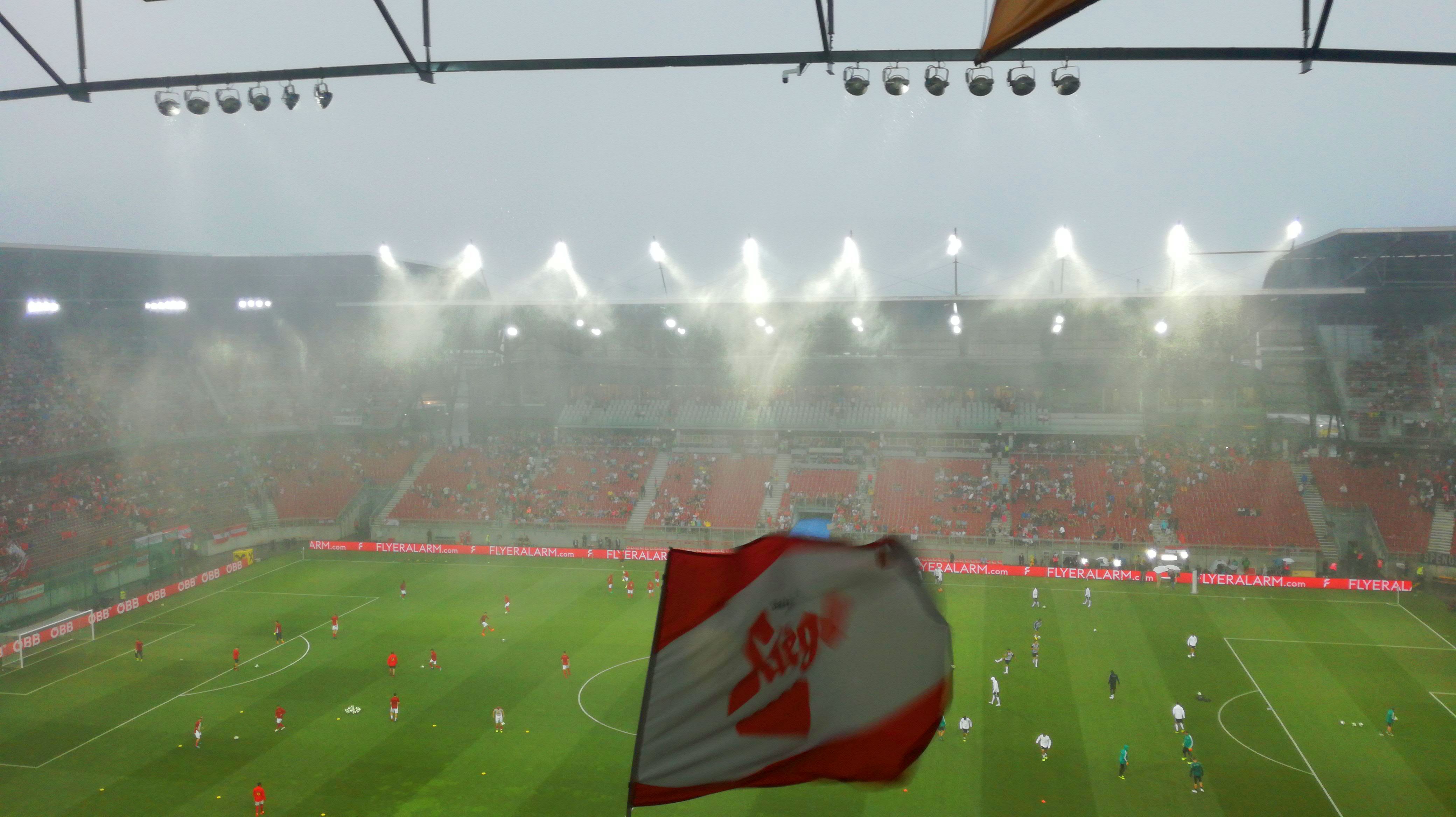 Guter Entscheid, denn nach 4 Platzbegehungen (bei denen unter dem Jubel des Volkes die Schiedsrichter Bälle in die Pfützen warfen, um sich gegenseitig nass zu spritzen) und 3 Verschiebungen wurde verkündet – es wird gespielt. Das Vorabprogramm startete – jeder schwang das vorbereitete gesponserte Fähnchen, es wurde Fendrich gespielt und Strauss Vater, dann erst unsere vom Deutschen geklaute Hymne und dann die eigene (und absolut keiner hat dieses depperte „TöchterSöhne“ gesungen). Irgendwie, tolle Stimmung. Man war siegesbereit.