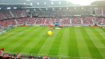 Und wie es vorher von oben geplätschert hat, so plätscherte die erste Halbzeit vor sich hin. Der Deutsche war im Felde überlegen, aber offensiv harmlos und hinne begann er, unsicherer zu werden. Langsam erkannten die unsrigem Buam, dass da was gehen könnte. So ein Unentschieden, das müsste ja drinnen sein. Und so wie die unten Kickenden das erkannten, so erkannten das auch die oben Sitzenden und die Stimmung erholte sich. Die Anfeuerungsgesänge wurden mehr und lauter, auch wurde der olle Gassenhauer „Wer nicht hüpft, ist Offenbacher!“ angestimmt. Ich fühlte mich wie im Wald, bloss mit Kickersfärbung.