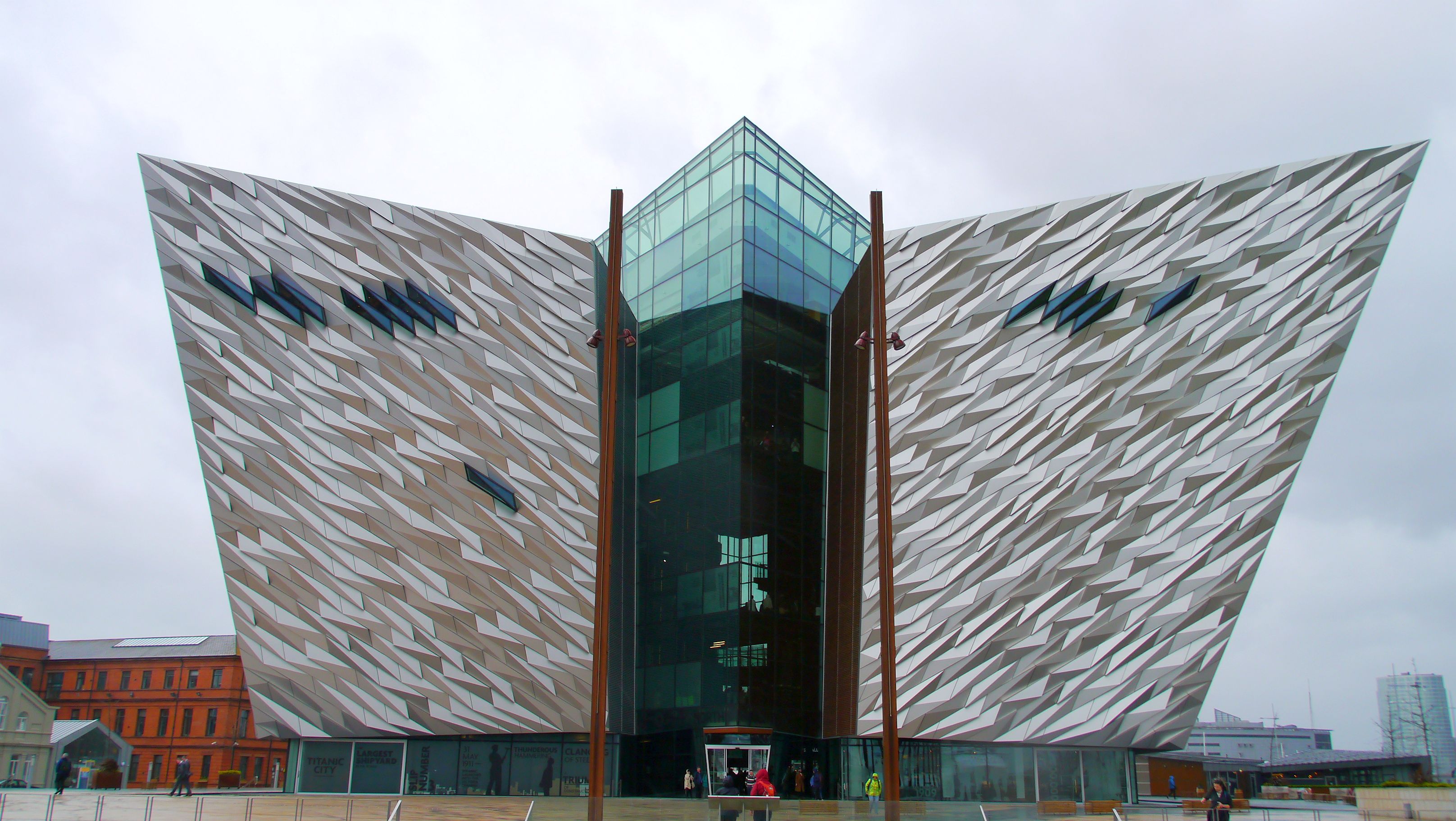 Nach dem Ablegen aus Dublin gings den kurzen Weg rüber nach Nordirland. Und da hats das erste Mal, seitdem wir jemals in Britannien waren, so richtig geschüttet. Also, Taxi geschnappt, mit ner netten Deutschen (die wir zufälligerweise schon da getroffen haben, obwohl wir mit ihr erst in Reykjavik verabredet waren) und einem Paar aus den US and A (bisserl über Trump amüsiert) geteilt, ab ans Titanic-Museum. Herrschaften, sollte einer mal nach Belfast kommen, das ist eine unbedingte Empfehlung. Genau am Ort der einstigen Titanic-Werft hat man ein hypermodernes Gebäude hingestellt, beeindruckend in Form und Inhalt.