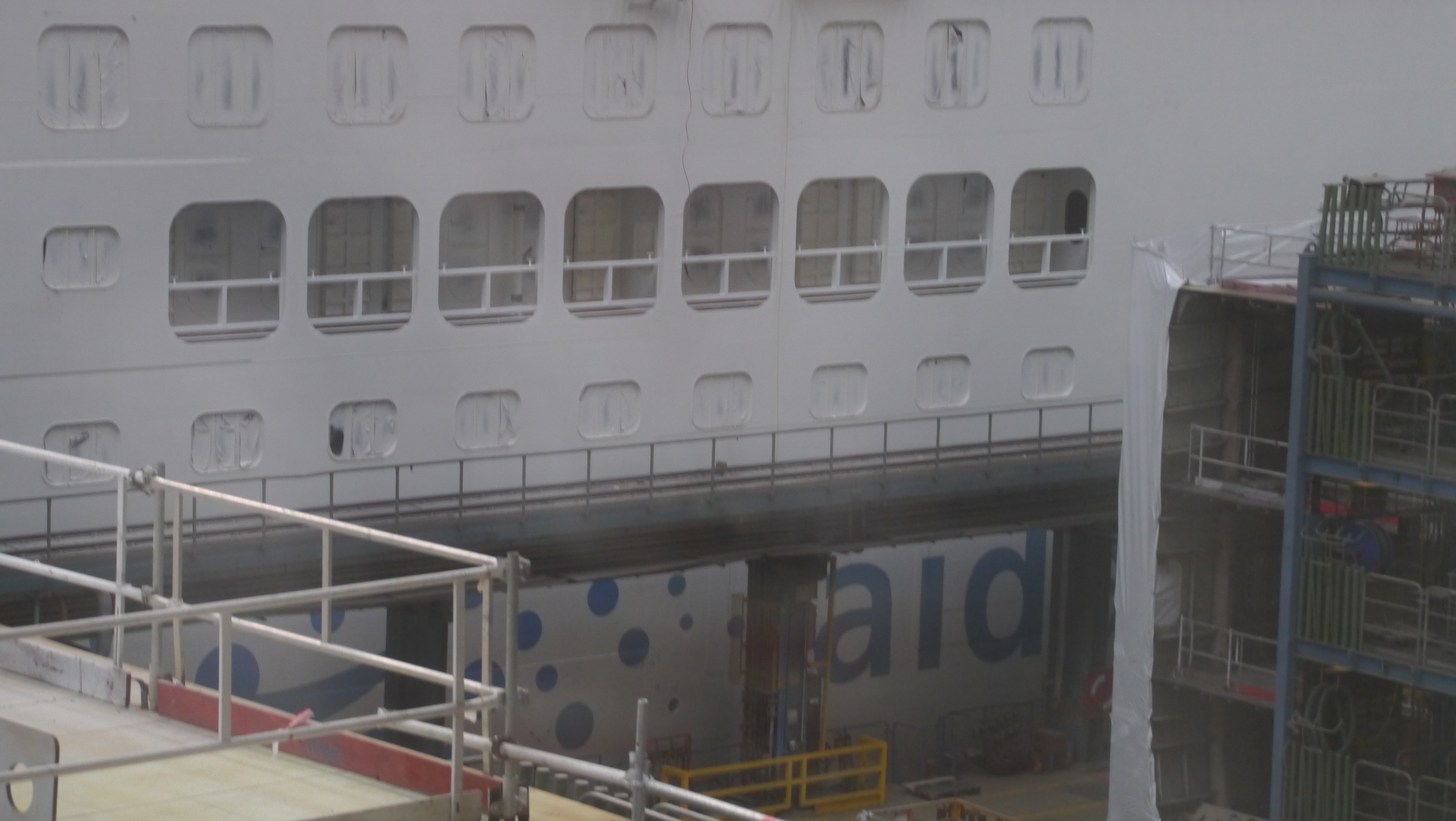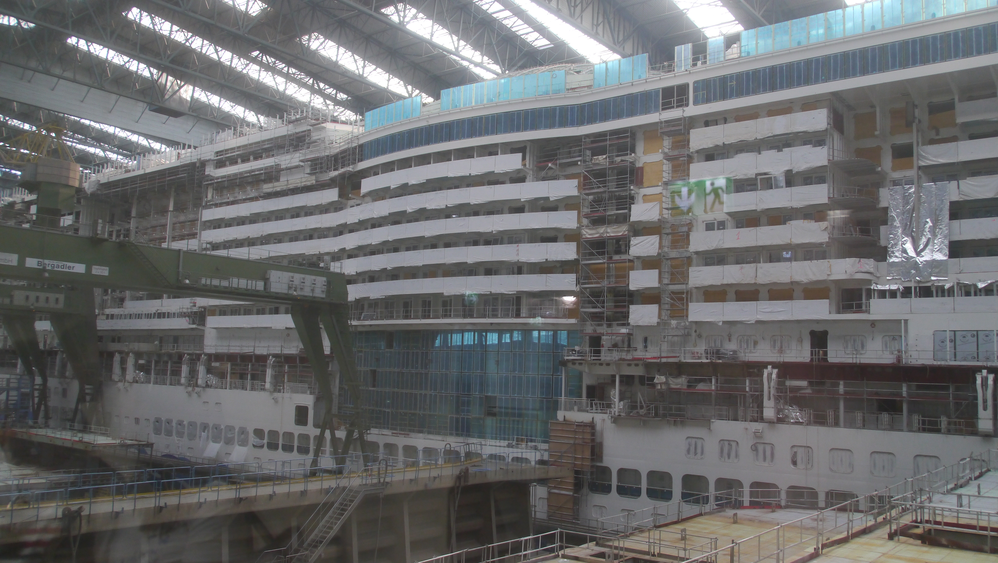 (Info für den Kenner – drinnen Aida Nova, bald fertig, wird im Herbst ausgeliefert. Draussen Spectrum of the Seas, liegt noch in Einzelteilen rum, wird Frühjahr 2019 ausgeliefert.)