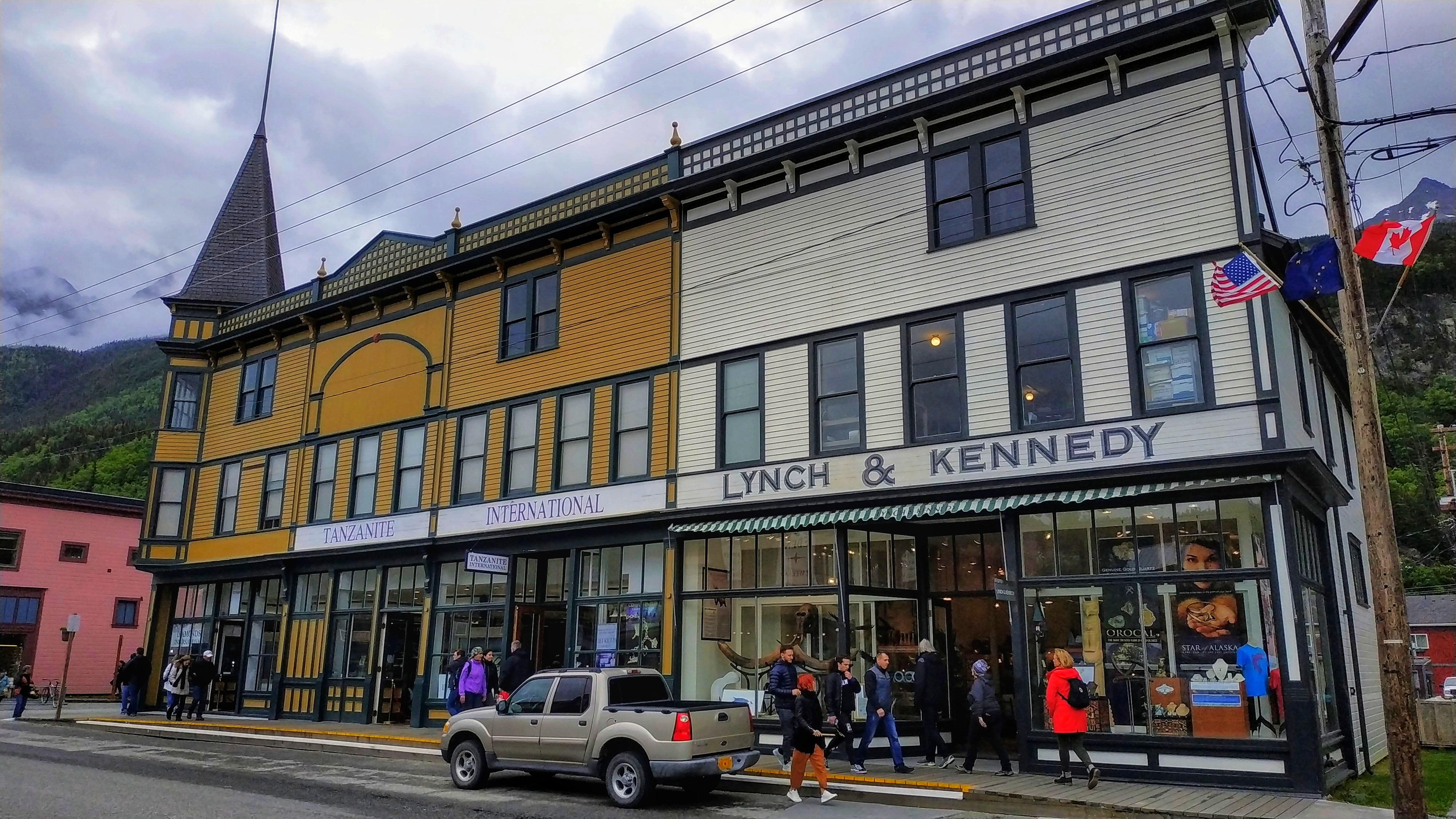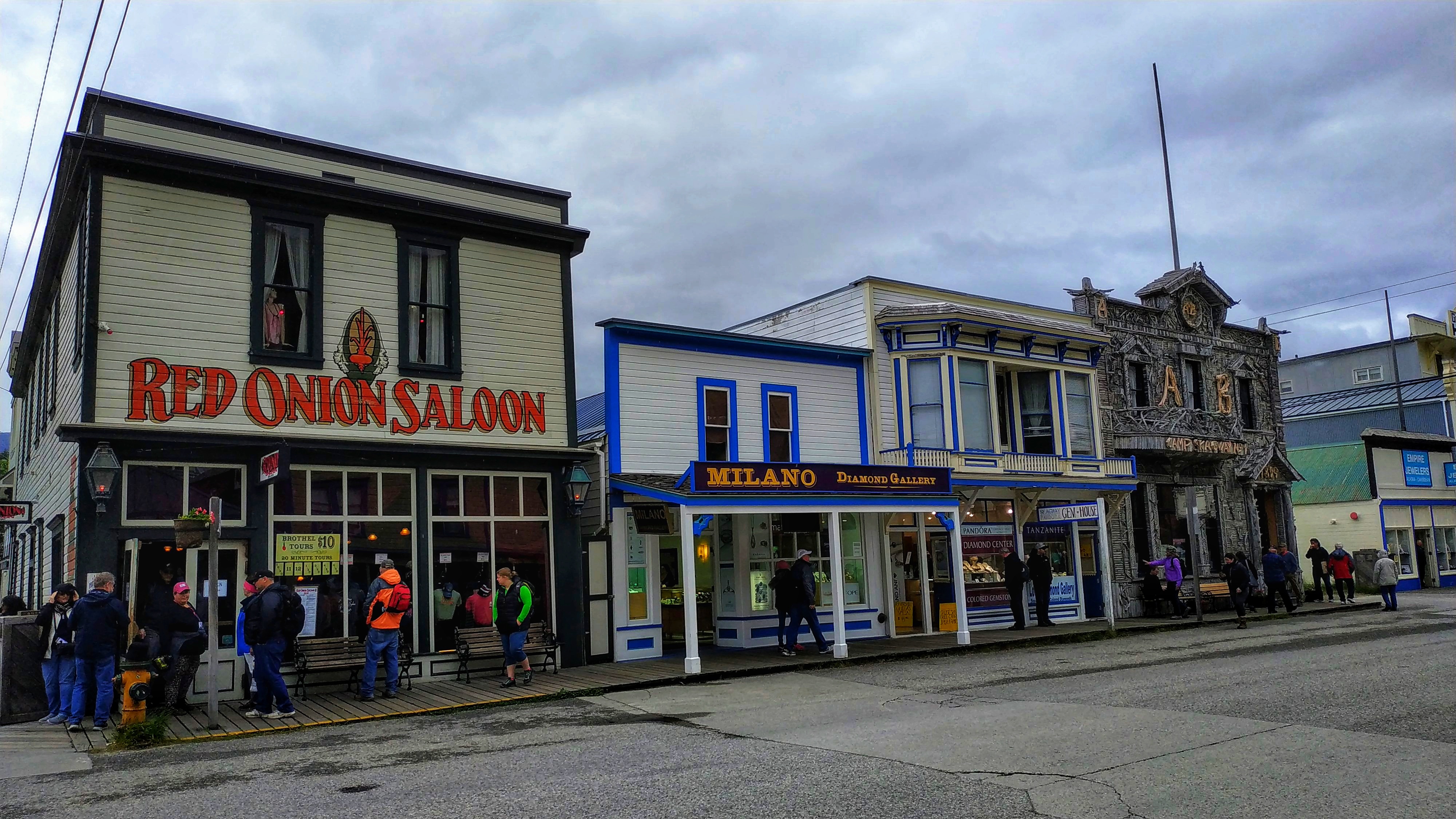 Ach, Skagway. Genau. Ist halt eines dieser austauschbaren Käffer an der Südwestküste von Alaska, die rein vom Touri leben. Hier gibts nix , ausser einem Saloon, einer Bank, einer Vielzahl von Souvenierläden und SchmuckSchmuckSchmuck. Aber irgendwie muggelig, mit alten Häuschen, Regen und Wind.